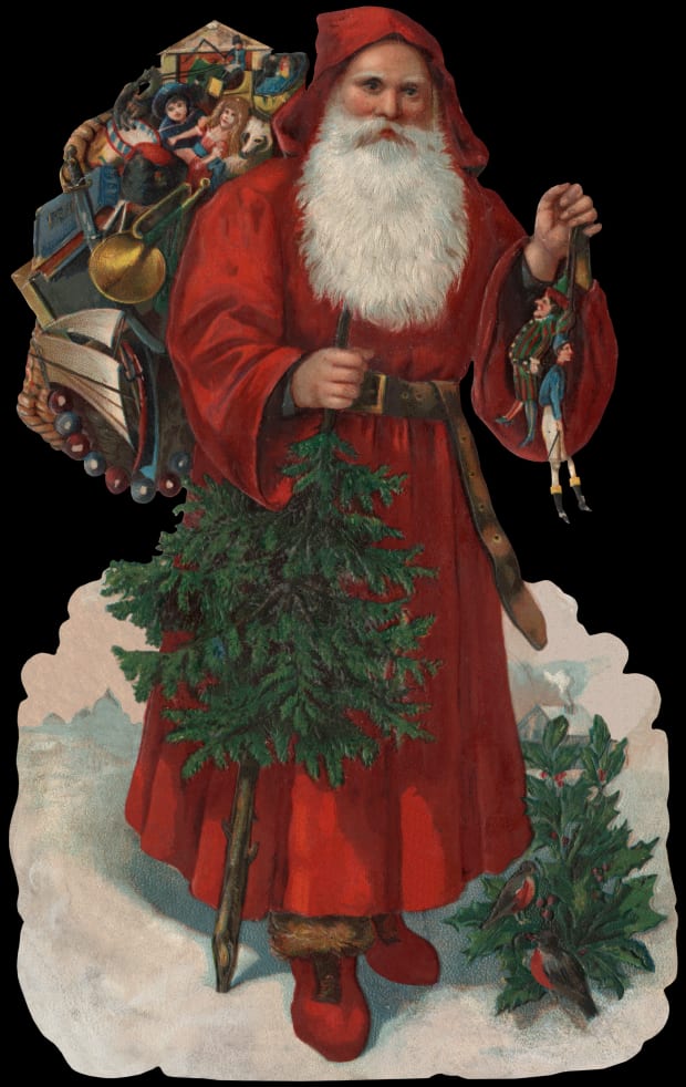 The iconic figure of Christmas is Santa Claus. The story, a memory of folk tales, has Santa flying from the North Pole each Christmas Eve in a sleigh powered by magic reindeer. Santa visits every home, climbing down the chimney and leaving presents under the tree. Pictures of Santa are everywhere, and figures of Santa decorate yards and roofs, stores and malls, and the tradition of sending Christmas cards.